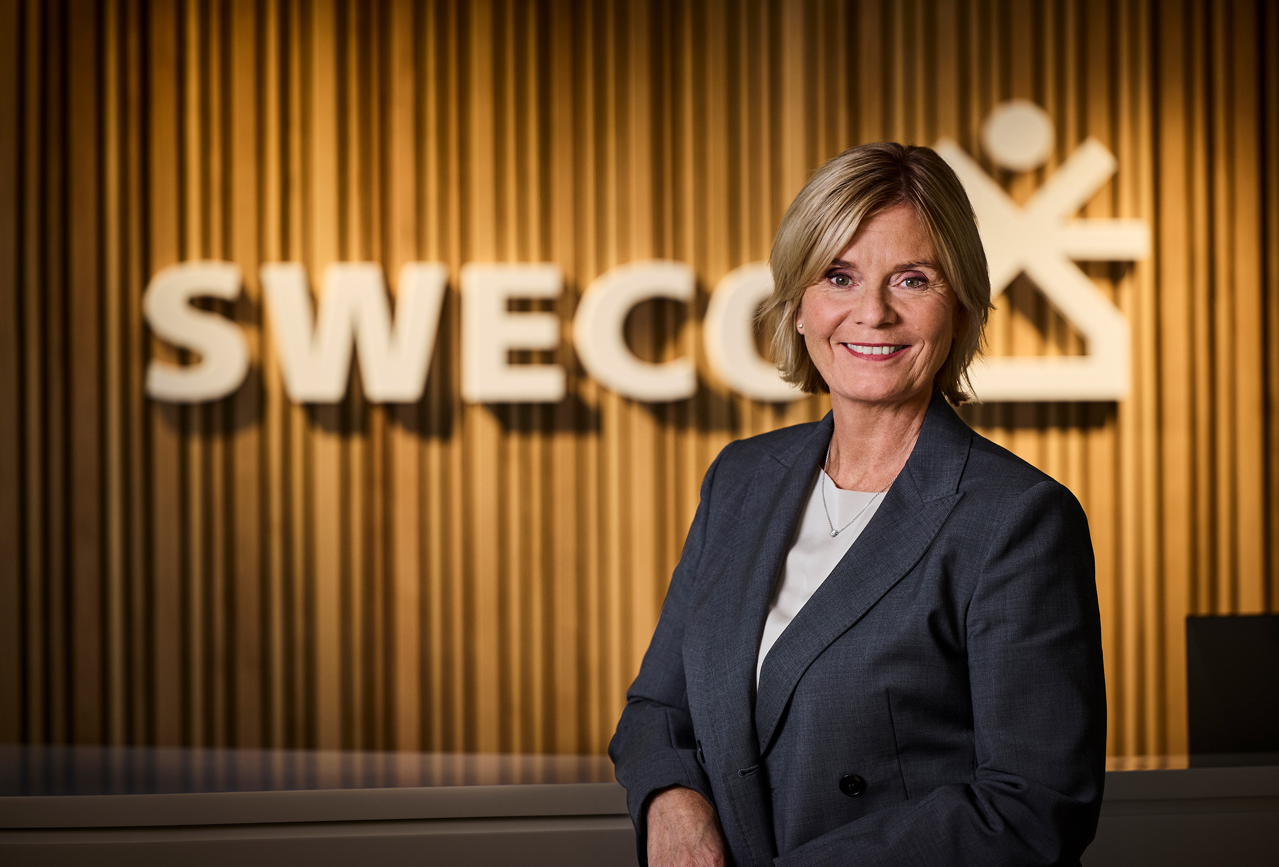 - Åsa Bergman, President and CEO of Sweco, with Sweco logotype. Free use, please credit photographer Måns Berg
