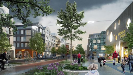 Sweco’s idea has its basis in the theme of ”Work-Live-Play”- creating a workplace of the future within a varied environment allowing its users the opportunity to live in the same area. The architectural concept is based on reducing the scale to a campus-like environment, one which offers service and stimulating environments at flexible times. The buildings are of varying sizes with individual architectonic expressions.