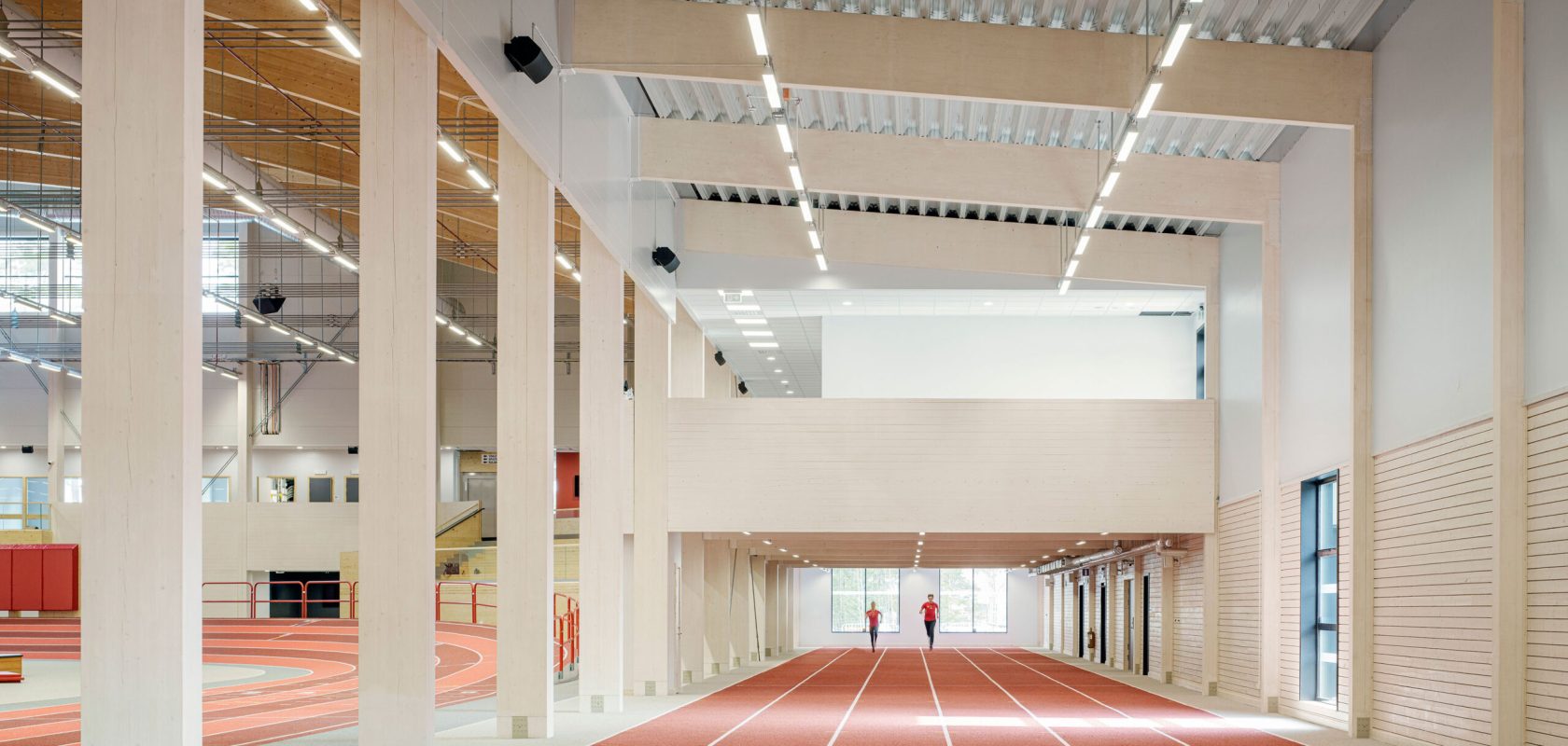 The balance between functionality and aesthetics creates an overall sense of harmony and contributes to the experience of the warm and active environment permeating the arena. The colours utilised in combination with the timber frame, create a welcoming feeling both for active participants as well as the spectators. To find the right colour for the floor in the sporting area, various proposals were considered initially, with a red tone chosen ultimately, to give the room warmth and energy.