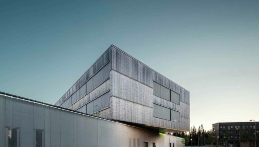 FCM Huset and Guldminen in the Danish town of Ikast are designed as “a ‘mini stadium’ “with a central football field and surrounding facilities for FC Midtjylland’s Superliga team and academy, as well as the private sports school Guldminen.