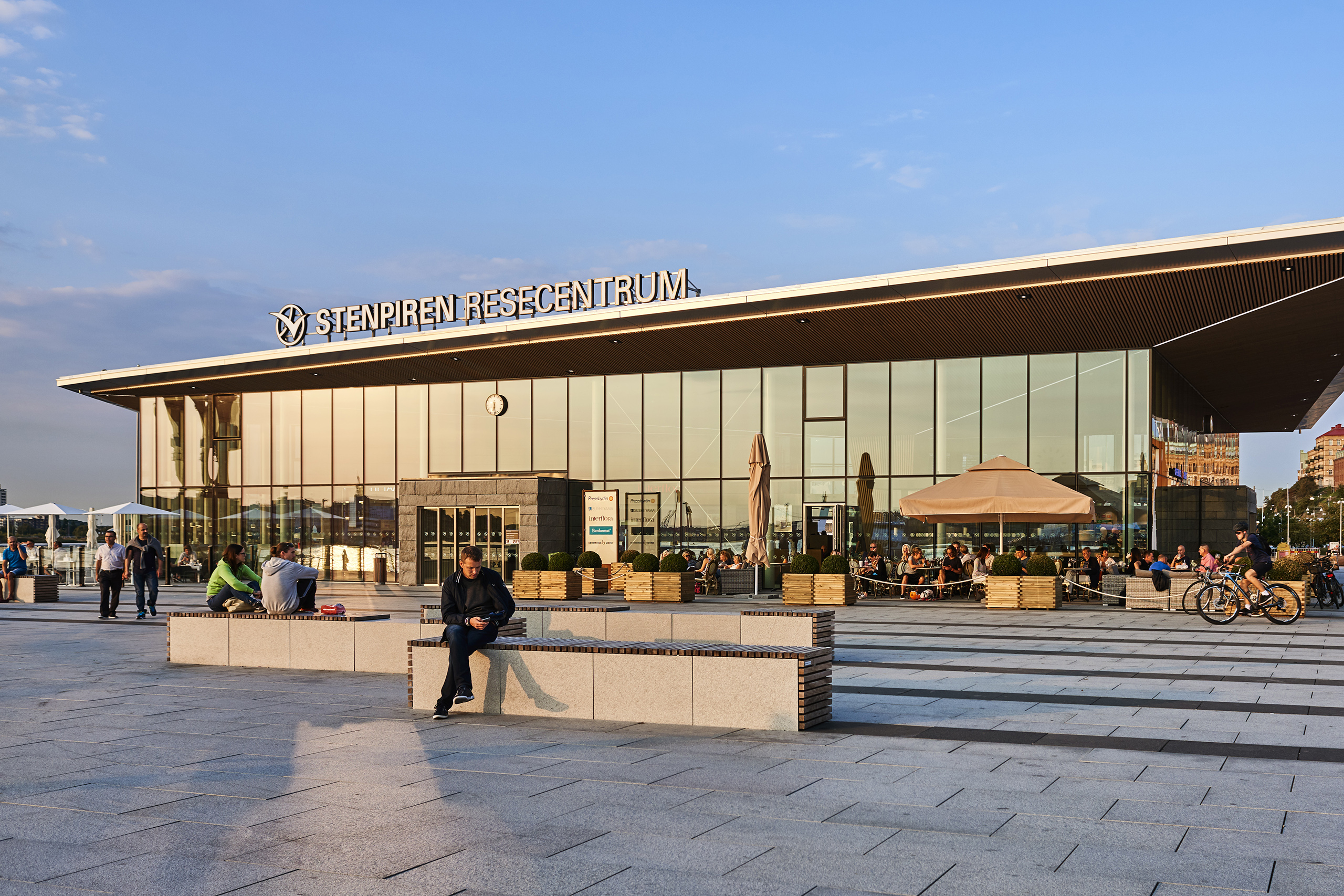 Stenpiren travel centre is situated at Skeppsbron in Gothenburg. It is an area that was previously dark and unused but which is now seething with life in renovated blocks, streets, squares, and quayside promenades with jetties and piers.