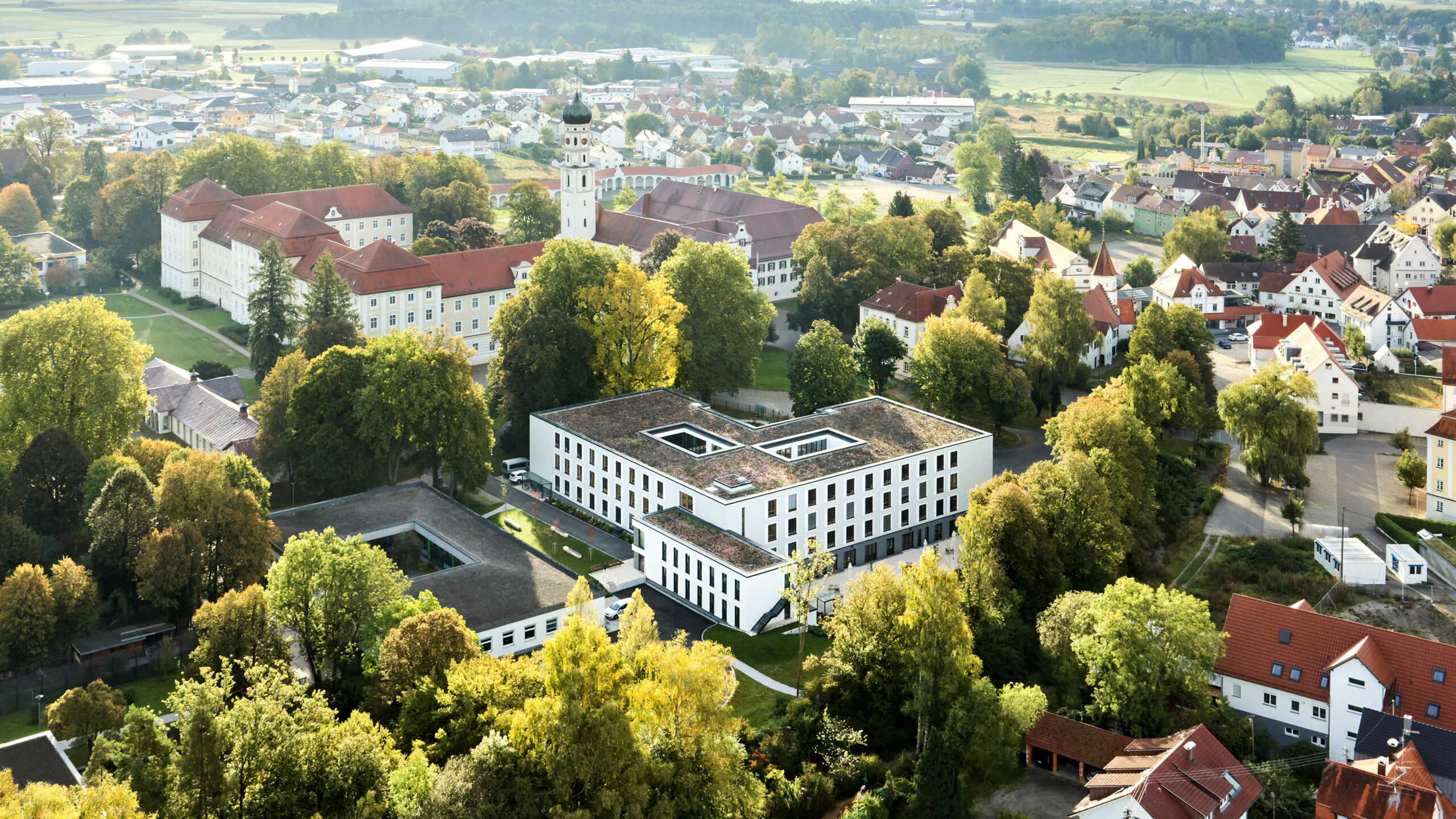 The new specialised nursing home is built like a campus with various buildings interspersed with park-like green areas, with the River Schussen flowing along the western boundary of the site. The grounds of the facilities are directly adjacent to the historical Schussenried Monastery.