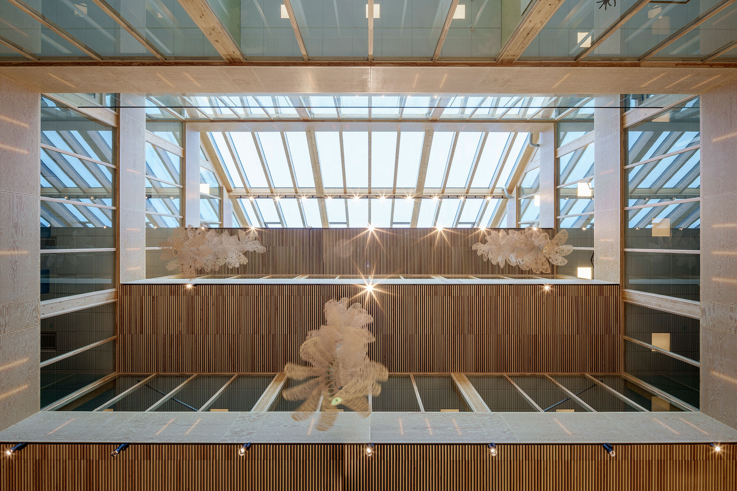 The construction has a timber frame consisting of cross-laminated timber elements and timber beam pillars. There are also a lot of wooden elements on display inside, such as the suspended ceilings, the wall coverings, floors and stairs. In the middle of the building is a large and open ‘living room’, with the wood creating a warm and welcoming feeling. This is one of the largest wooden buildings ever built in Sweden.