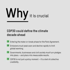 The delegates will gather after a truly turbulent year in global development. Multiple crises, increasing nationalism, rising conflicts and quite many steps away from the world order we knew – where international cooperation has been the norm back since the aftermath of World War II. The US has applied for leaving the Paris Agreement and the exit will be ratified in January 2026. So, formally still being a signatory there’s been a lot of uncertainty whether they would still show up for the COP30. We just recently received notice that the US will not send a formal negotiating delegation. However, the US will be well represented through progressive states, cities and businesses that have high stakes in climate matters.